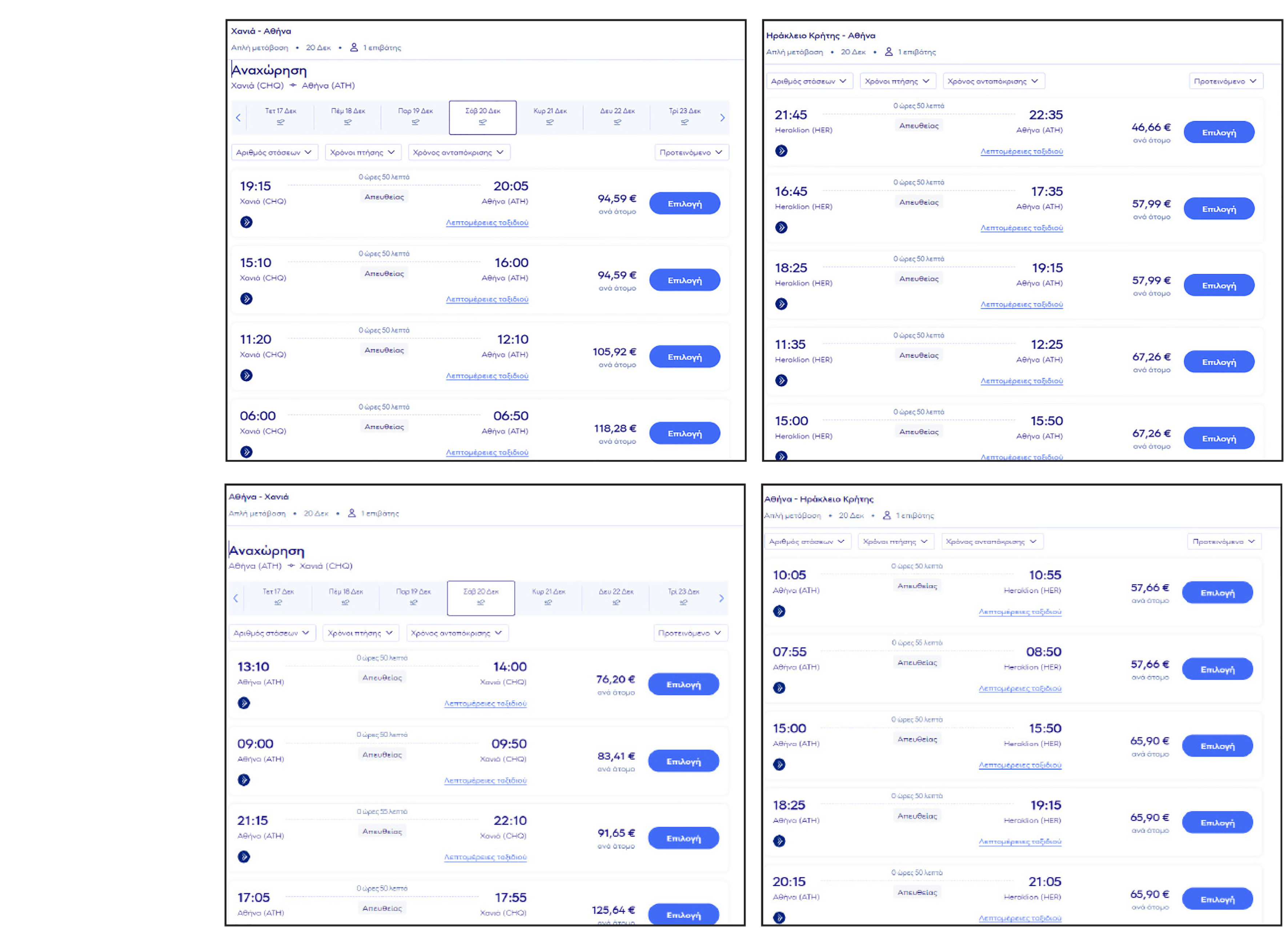 Πήραμε δύο ημερομηνίες του Δεκεμβρίου. Συγκεκριμένα ξεκινήσαμε με τις 20 Δεκεμβρίου να φύγουμε από Χανιά για Αθήνα και επιστροφή την ίδια μέρα. Το ίδιο κάναμε και για το Ηράκλειο.